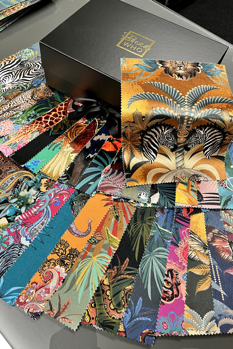 For those with a penchant for Animal Prints, we offer a Samples Box Set of 16x16 cm swatches. Compact but beautiful, this set offers a look at the colours and feel of the fabrics, housing the full collection with an example of each design and colour way.