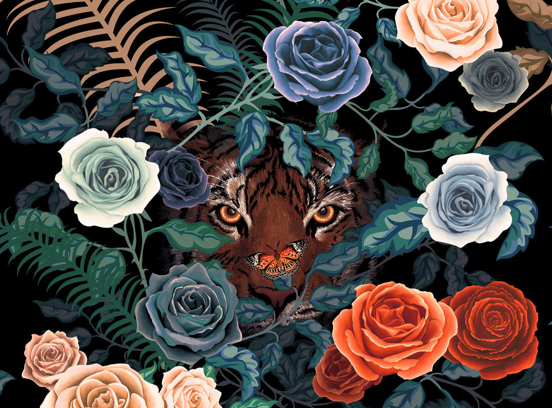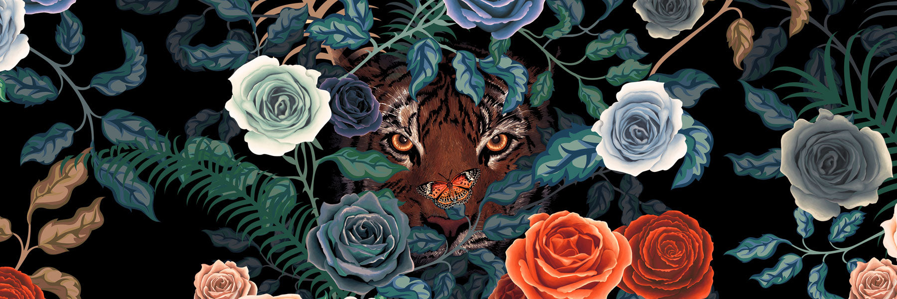 The Jet colour way of Garden Treasures offers a vibrant celebration of country gardens on sumptuous velvet, featuring an array of critters and flowers in colourful hues on rich black.